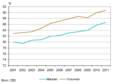 In 2011 volgden bijna 1,3 miljoen jongeren van 18 tot 25 jaar nog onderwijs of hadden met een startkwalificatie het onderwijs verlaten. Dit is bijna 89 procent van het totaal aantal jongeren van deze leeftijd. In 2001 lag dit aandeel nog op ruim 81 procent. De toename onder vrouwen was in deze periode iets groter dan onder mannen.