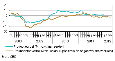 De gemiddelde dagproductie van de Nederlandse industrie was in februari 2012 ruim 3 procent lager dan in februari 2011. In januari nam de productie met ruim 1 procent af ten opzichte van januari 2011. De industrie behaalde in februari nog wel 1,5 procent meer omzet, maar de verkochte producten van de industrie waren bijna 5 procent duurder dan een jaar eerder. In januari bedroeg de omzetstijging nog ruim 8 procent.