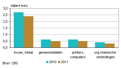 De invoer van geneesmiddelen uit Singapore bedroeg ruim een half miljard euro. Dit is ruim 20 procent van de totale invoer. Daarnaast zijn computers en printers (aandeel 19 procent) en organische chemische verbindingen (aandeel 13 procent) belangrijke importproducten. Samen zijn deze goed voor meer dan de helft van de totale invoer uit Singapore.