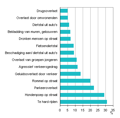 Het meeste hebben mensen last van het verkeer en van verloedering, hoewel die de laatste tijd wel minder is geworden. Grote ergernissen zijn te hard rijden en hondenpoep op straat - desgevraagd geeft een derde van de mensen aan dat dit vaak voorkomt –, gevolgd door parkeeroverlast en rommel op straat. Daarna komen geluidsoverlast door het verkeer, agressief verkeersgedrag, overlast van groepen jongeren en vernielingen van straatmeubilair.