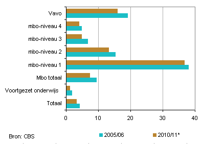 Gemiddeld verliet 3,2 procent van de jongeren onder de 23 jaar in het schooljaar 2010/’11 voortijdig het onderwijs. De uitvalpercentages lopen per opleiding en per onderwijssoort sterk uiteen. Onder leerlingen in het voortgezet onderwijs was het aandeel voortijdige schoolverlaters in het schooljaar 2010/11 slechts 1,1 procent tegen 7,3 procent in het mbo. Binnen het mbo verlaten met name jongeren uit de assistentopleiding (niveau 1) en de basisberoepsopleiding (niveau 2) vaker voortijdig de school met 36,6 respectievelijk 13,1 procent uitval.