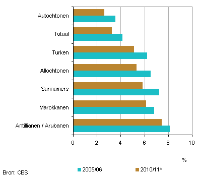 De uitval onder allochtone leerlingen is ongeveer twee keer zo groot als onder autochtone leerlingen: 5,3 versus 2,6 procent. Van de eerste generatie niet-westerse allochtone leerlingen verliet in het schooljaar 2010/11 zelfs 8,0 procent voortijdig de opleiding. De tweede generatie niet-westerse allochtone leerlingen verlaat met 5,0 procent in verhouding tot eerste generatie niet-westerse allochtonen minder vaak voortijdig het onderwijs. Antillianen, Arubanen en leerlingen van Marokkaanse afkomst verlaten in verhouding het vaakst het onderwijs zonder startkwalificatie.