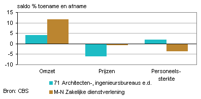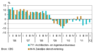 Het eerste kwartaal van 2012 gaf geen teken van herstel. De architecten- en ingenieursbureaus boekten samen een omzetdaling van 3,8 procent ten opzichte van het eerste kwartaal van 2011. De omzet van de gehele zakelijke dienstverlening daalde slechts met 0,3 procent.