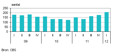 Het aantal uitgesproken faillissementen over bedrijven in de detailhandel is in het eerste kwartaal van 2012 op het hoogste niveau gekomen sinds de start van de waarneming in 1993. Er werden in totaal in de eerste drie maanden van dit jaar 208 faillissementen uitgesproken. Vooral in januari (82) waren er veel uitgesproken faillissementen. Dit betreft op maandbasis het grootste aantal in de afgelopen 20 jaar. In februari (66) en maart (60) was het aantal faillissementen iets kleiner, hoewel februari daarmee ook in de top tien van de laatste 20 jaar staat.