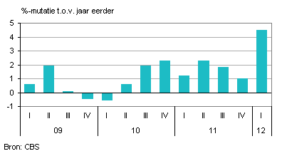 De detailhandel heeft in het eerste kwartaal van 2012 een omzetgroei van 1,5 procent gerealiseerd. Deze toename was toe te rekenen aan hogere prijzen, het volume kromp. Ook het koopdagenpatroon pakte gunstig uit in vergelijking met het eerste kwartaal van 2011. Als de positieve invloed van het koopdagenpatroon en de hogere prijzen buiten beschouwing worden gelaten, dan laat de detailhandel een afname van de omzet zien.