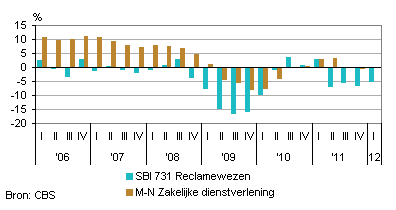 In het eerste kwartaal van 2012 liet het reclamewezen wederom een omzetdaling zien. Ten opzichte van het eerste kwartaal van 2011 is de omzet met 5,3 procent afgenomen. Het omzetniveau in het reclamewezen is sinds 2006 nog niet zo laag geweest. De omzetafname was ook aanzienlijk sterker dan in de totale zakelijke dienstverlening. Hier werd in het eerste kwartaal van 2012 0,3 procent minder omgezet dan een jaar eerder. Van alle ondernemers in de zakelijke dienstverlening doen alleen de architecten en de markt- en opinieonderzoekers het slechter dan de ondernemers in het reclamewezen.