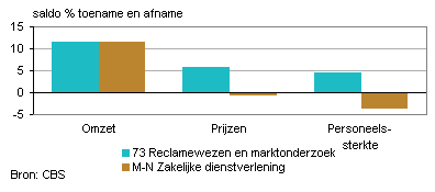 Het aantal ondernemers in het reclamewezen en marktonderzoek dat een toename van de omzet in het komende kwartaal voorziet, is ten opzichte van het vorige kwartaal toegenomen. Per saldo verwacht ruim 10 procent dat de omzet in het tweede kwartaal van 2012 zal toenemen. Dit percentage is nagenoeg gelijk aan dat van de totale zakelijke dienstverlening. Het aantal ondernemers dat een verhoging van de tarieven verwacht is net iets groter dan het aantal dat een verlaging voorziet. De bedrijven in het reclamewezen en marktonderzoek die een toename van de werkgelegenheid voorzien, zijn licht in de meerderheid. Per saldo verwacht bijna één op de twintig ondernemers een toename van het personeelsbestand.