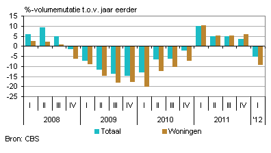 In het eerste kwartaal van 2012 waren de bruto-investeringen in vaste activa 5,2 procent lager ten opzichte van het overeenkomstige kwartaal een jaar eerder. Dit is een omslag ten opzichte van 2011 waarin de investeringen in alle kwartalen hoger waren dan in de overeenkomstige kwartalen een jaar eerder. De investeringen in woningen daalden in het eerste kwartaal van 2012 met 9,3 procent en die in bedrijfsgebouwen met 11,5 procent. Ook de investeringen in gww namen af met 10,4 procent.