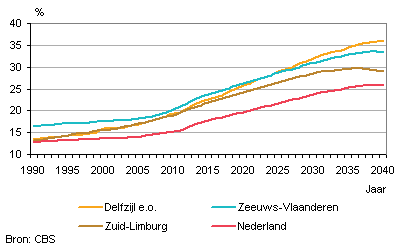 Tussen 1990 en 2012 groeide het aandeel 65-plussers in Nederland van 12,8 procent tot ruim 16 procent. In 2040 ligt dit aandeel naar verwachting op een kwart. In de drie krimpregio’s ligt het aandeel 65-plussers nu al boven de 20 procent (grafiek 2). In Delfzijl en omstreken slaat de vergrijzing het hardst toe door de meest langdurig aanhoudende daling van het aandeel jongeren. Verwacht wordt dat in Zuid-Limburg en Zeeuws-Vlaanderen rond 2025 het aandeel jongeren juist weer zal toenemen. Dit zal in Zuid-Limburg uiteindelijk leiden tot een daling van het aandeel 65-plussers.