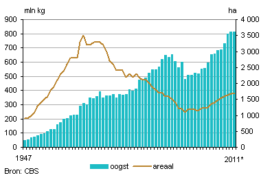 Areaal en oogst tomaten, 1947 - 2011*