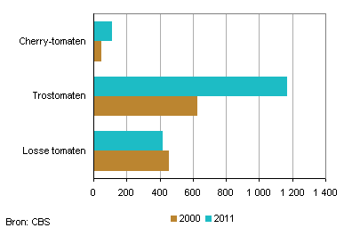 De teelt van de trostomaat heeft veel terrein gewonnen. Het areaal trostomaten is sinds 2000 bijna verdubbeld en bedroeg 1,2 duizend hectare in 2011. Ook de teeltoppervlakte van de cherrytomaat nam fors toe en steeg in die periode van 51 hectare naar 111 hectare. De teelt van de traditionele losse tomaat daalde licht.