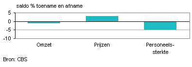De ondernemers in de horecabranche zijn over het derde kwartaal van 2012 pessimistischer gestemd dan een kwartaal eerder. Het aantal ondernemers dat een toename van de omzet voorziet, is nagenoeg gelijk aan het aantal dat een afname verwacht. Een kwartaal eerder verwachtte per saldo nog 17 procent van de ondernemers een omzettoename. Verder verwacht drie procent van de ondernemers een stijging van de prijzen door te voeren in de komende drie maanden. Dit was een kwartaal eerder nog ruim 11 procent. Over de werkgelegenheid zijn de ondernemers ook pessimistischer gestemd. Per saldo voorziet 5 procent van de ondernemers een krimp van hun personeelsbestand terwijl een kwartaal eerder per saldo 10 procent een uitbreiding voorzag.