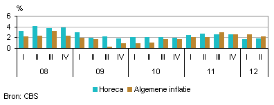 De prijzen in de traditionele horeca stegen in het tweede kwartaal van 2012 met 1,8 procent in vergelijking met hetzelfde kwartaal in 2011. De stijging is iets hoger dan een kwartaal eerder en 0,4 procentpunt lager dan de inflatie in het tweede kwartaal van 2012. Bij cafetaria’s en cafés stegen de prijzen het meest. De omzettoename in de traditionele horeca is toe te schrijven aan hogere prijzen. Het volume kromp licht met 0,2 procent.
