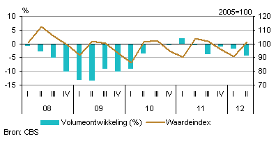 Cafés behaalden in het tweede kwartaal minder omzet dan een jaar eerder. Mede door het slechte weer daalde de omzet met 2,2 procent. De omzetkrimp is volledig toe te schrijven aan het volume dat met 4,4 procent daalde in vergelijking met het tweede kwartaal van 2011. De prijzen stegen met ruim 2 procent.