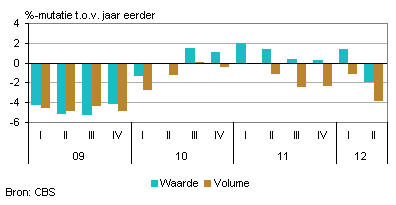 In het tweede kwartaal van 2012 was de omzet van de detailhandel 2,0 procent lager dan in hetzelfde kwartaal een jaar eerder. Dit betreft de eerste omzetdaling sinds het tweede kwartaal van 2010. De omzetafname werd veroorzaakt doordat het volume circa 4 procent kleiner was dan vorig jaar. Daarmee kromp het volume bijna net zo sterk als in de vier kwartalen van 2009. Ook van medio 2010 tot en met het eerste kwartaal van 2012 was er een teruggang in het volume, maar steeg de omzet in deze kwartalen nog wel. Hogere prijzen konden toen het volumeverlies nog compenseren. Ook in het tweede kwartaal stegen de prijzen (2,0 procent). Deze stijging was echter onvoldoende om een omzetdaling te voorkomen. Vooral in april (-9,4 procent) werd er in de detailhandel minder omzet behaald dan een jaar eerder. Dit kwam voornamelijk doordat het koopdagenpatroon minder gunstig uitpakte dan vorig jaar. In mei en juni nam de omzet weer enigszins toe.