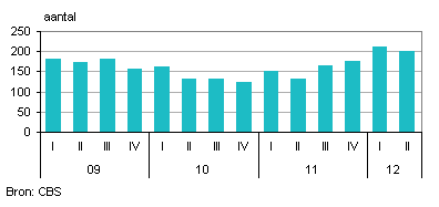 In het tweede kwartaal van 2012 is het aantal uitgesproken faillissementen in de detailhandel iets afgenomen ten opzichte van een kwartaal eerder. Van april tot en met juni werden er 200 faillissementen uitgesproken. In het eerste kwartaal kwam het aantal faillissementen nog uit op 211. Vooral in april (46) was het aantal uitgesproken faillissementen aan de lage kant. In mei (69) en in juni (85) werden er meer faillissementen uitgesproken dan in april. In vergelijking met voorgaande jaren ligt in het tweede kwartaal van 2012 het aantal faillissementen, net als in het eerste kwartaal van dit jaar, wel hoger dan in de voorgaande 20 jaar.