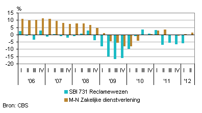 Nadat vorig kwartaal het laagste omzetniveau sinds 2006 werd bereikt in het reclamewezen, was de omzet in het tweede kwartaal van 2012 weer terug op het niveau van een jaar eerder. Dit is in tegenstelling tot de vier voorgaande kwartalen. Toen werd gemiddeld per kwartaal nog ruim 5 procent minder omgezet dan in hetzelfde kwartaal het jaar ervoor. Het omzetniveau van voor de economische crisis is echter nog niet in zicht. Ook in het tweede kwartaal van 2012 heeft het reclamewezen het in vergelijking tot de zakelijke dienstverlening als geheel slechter gedaan. In de Zakelijke dienstverlening werd 1,3 procent meer omzet geboekt.