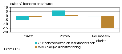 Per saldo verwacht bijna 5 procent van de ondernemers in het reclamewezen en marktonderzoek een afname van de omzet in het derde kwartaal. Een kwartaal eerder verwachtte per saldo nog ruim 11 procent een omzettoename. Qua tarieven verwacht per saldo zes procent van de ondernemers, net als een kwartaal eerder, een verhoging door te voeren.