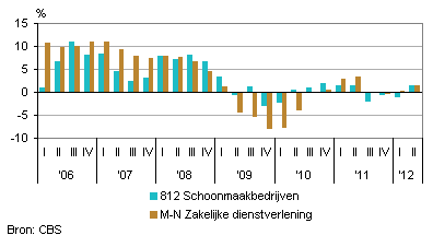 De omzet van de Schoonmaakbedrijven liet in het tweede kwartaal van 2012 een licht herstel zien ten opzichte van dezelfde periode een jaar eerder. De stemming onder de ondernemers in de schoonmaakbranche was echter negatief. Het economisch klimaat is in het tweede kwartaal van dit jaar verslechterd en ook voor het derde kwartaal verwachten de ondernemers een verdere verslechtering. Ondanks de voorziene prijsstijging, blijft de omzet naar verwachting gelijk. Daarnaast verwachten de ondernemers minder personeel in te zetten in het derde kwartaal.