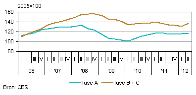 Het aantal uitzenduren (fase A) nam in het tweede kwartaal van 2012 af met 1,3 procent ten opzichte van hetzelfde kwartaal een jaar eerder. Hiermee heeft de negatieve ontwikkeling van het eerste kwartaal zich voortgezet. Over heel 2011 was er nog sprake van een toename van 8 procent. Het aantal detacheringsuren (fase B + C) nam, in vergelijking tot de uitzenduren, met 0,1 procent minder sterk af. Voor het eerst sinds het eerste kwartaal van 2010 was de ontwikkeling van het aantal detacheringsuren positiever dan die van de uitzenduren. De daling van het totale aantal uren (fase A+B+C) kwam voor het tweede kwartaal van 2012 uit op 0,9 procent.
