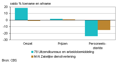 Voor het derde kwartaal van 2012 heeft per saldo bijna één op de vijf ondernemers in de uitzend- en arbeidsbemiddelingsbranche een positieve omzetverwachting. De ondernemers in de zakelijke dienstverlening als geheel zijn daarentegen minder optimistisch. Per saldo voorzien zij een omzetkrimp in het derde kwartaal. Voor wat betreft de werkgelegenheid verwachten de uitzend- en arbeidsbemiddelingsbureaus net als de zakelijke dienstverleners een afname in het derde kwartaal.
