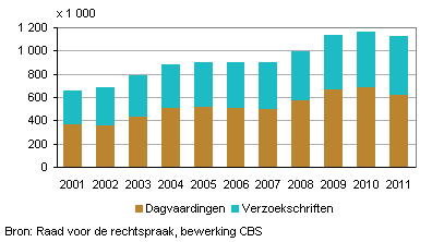 Dagvaardingszaken eindigen in de meeste gevallen met een vonnis. Het aantal dagvaardingen en vonnissen is in 2011 met bijna 10 procent gedaald, nadat het tussen 2001 en 2010 verdubbelde. Deze ontwikkeling wordt voor een aanzienlijk deel bepaald door het aantal incassozaken. De daling in 2011 hangt mogelijk samen met de eind 2010 ingevoerde verhoging van de griffierechten. Hierdoor is het minder aantrekkelijk om bij een kleine vordering naar de rechter te stappen. Ook de wetgeving rond wanbetalers van de zorgverzekering speelt een rol. Door een wetswijziging in 2009 (zie kader) staat hier geen incassotraject via de rechter meer open. In 2010 was er nog een werkvoorraad van dergelijke zaken.