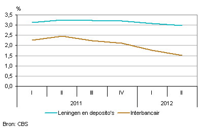 De inkomsten uit bankdiensten is het verschil tussen de rente die op deposito’s wordt vergoed of op leningen in rekening wordt gebracht en de rente die banken elkaar onderling in rekening brengen. De driemaands-Euriborrente is de belangrijkste component van deze interbancaire rente waarmee de marktrenten op leningen en deposito’s vergeleken worden. Deze Euriborrente bedroeg in het tweede kwartaal 0,69 procent en dat is een stuk lager dan in het overeenkomstige kwartaal van 2011, toen bedroeg deze rente 1,42 procent. De rente op uitstaande leningen en opgenomen deposito’s daalde minder hard. Daardoor is het renteverschil tussen de interbancaire rente en de rente op uitstaande leningen en opgenomen deposito’s, dat gezien wordt als de vergoeding voor de bankdiensten, toegenomen. Dit heeft een positief effect gehad op de productiewaarde. Het intermediair verbruik van het bankwezen nam door de toename van het renteverschil juist af.