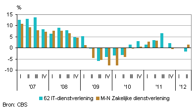 De omzet van de IT-dienstverlening daalde in het tweede kwartaal van 2012 met 1,8 procent ten opzichte van het tweede kwartaal van 2011. Deze daling is sterker dan in het eerste kwartaal van 2012 toen de omzet met 0,1 procent afnam. Hiermee is er sprake van een omslag in de omzetontwikkeling van de IT-dienstverleners die sinds het tweede kwartaal van 2010 positief was. De Zakelijke dienstverleners deden het evenals in het eerste kwartaal beter. Hun omzet nam met 1,3 procent toe.