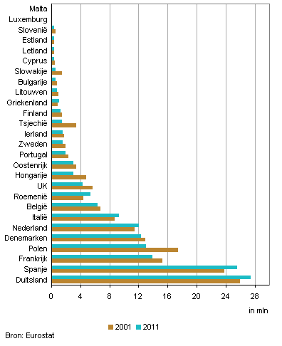In de periode 2001-2011 is het aantal varkens in de meeste EU-landen afgenomen. Er waren zes landen waar het aantal varkens toenam. In Duitsland en Spanje is de varkensstapel fors gestegen, maar ook in Nederland steeg het aantal varkens.
