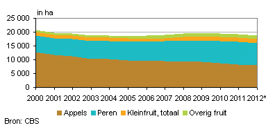 De teeltoppervlakte voor fruit is in 2012 voor het derde jaar op rij gedaald. Het areaal nam ten opzichte van 2011 met 450 hectare af tot 18,8 duizend hectare. Verder is het areaal wijndruiven met 5 hectare gedaald, terwijl dit in de jaren 2006 tot en met 2011 ieder jaar steeg.