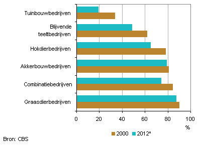 Ten opzichte van 2000 daalde de gezinsarbeid bij alle hoofdbedrijfstypen. De tuinbouwbedrijven tekenden voor de grootste afname. Het aandeel daalde bij deze groep met 14 procent. Bij de akkerbouwbedrijven en graasdierbedrijven was de afname gering, respectievelijk 2 en 3 procent. Opvallend zijn de verschillen in het aandeel gezinsarbeid per hoofdbedrijfstype. Zo bedroeg dit aandeel in 2012 bij de graasdierbedrijven 86 procent en bij de tuinbouwbedrijven slechts 19 procent.