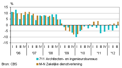 In het derde kwartaal van 2012 krompen de omzetten van de architecten en ingenieurs met 2,7 procent ten opzichte van dezelfde periode een jaar eerder. De omzet daalt nu al sinds het tweede kwartaal van 2009. Wel zwakt de omzetdaling de afgelopen 5 kwartalen geleidelijk af. De omzet van de zakelijke dienstverlening als geheel steeg voor het derde kwartaal op rij: nu met 2,6 procent.