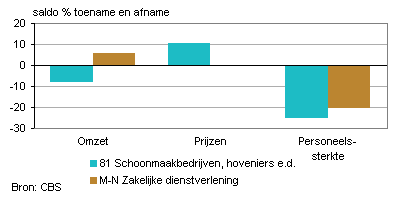 De schoonmaakbedrijven hebben in het derde kwartaal van 2012 meer omgezet dan in hetzelfde kwartaal een jaar eerder. Ook ontwikkelde de omzet zich sterker dan in het kwartaal ervoor. Toch was de stemming onder de ondernemers in de schoonmaakbranche in het derde kwartaal van 2012 somber. Voor het vierde kwartaal verwachten zij dan ook een daling van de omzet en van het personeelsbestand.
