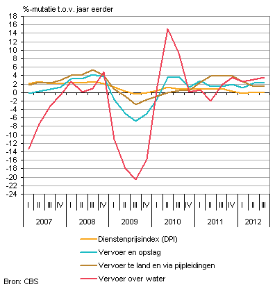 In de sector vervoer en opslag waren in het derde kwartaal van 2012 de prijzen 2,3 procent hoger dan een jaar eerder. De grootste stijging deed zich voor bij de prijzen van vervoer over water, met 3,5 procent. De prijzen van vervoer te land en via pijpleidingen stegen met 1,6 procent. Net als vorige kwartalen werd de prijsstijging in de transportsector onder andere veroorzaakt door de gestegen brandstofkosten.