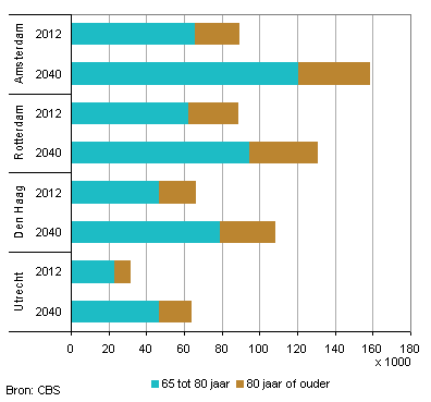 Als gevolg van de vergrijzing, die in alle delen van Nederland plaatsvindt, neemt ook in de vier grote steden het aantal ouderen fors toe. Met name in Amsterdam is die toename naar verwachting groot: het aantal personen van 65 jaar of ouder groeit daar van 90 duizend in 2012 tot 159 duizend in 2040, een verschil van 69 duizend. In Utrecht verdubbelt het aantal 65-plussers naar 64 duizend in 2040. In Den Haag neemt het toe van 67 duizend naar 109 duizend en in Rotterdam van 89 duizend naar 134 duizend Van de extra 65-plussers in de vier grote steden in 2040 zal ongeveer een kwart 80 jaar of ouder zijn.