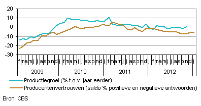 De gemiddelde dagproductie van de Nederlandse industrie lag in november 0,7 procent hoger dan in november 2011. In de voorgaande maand kromp de productie met 1,7 procent. De industrie behaalde in november 1,1 procent minder omzet dan een jaar eerder. Op de binnenlandse markt was de omzetkrimp groter dan op de buitenlandse markt.