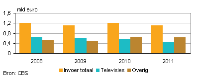 Er werd in 2011 voor bijna een half miljard euro aan televisies uit Slowakije ingevoerd. Dat is een kwart minder dan in 2010. Met een aandeel van bijna 40 procent in de invoer zijn televisies het belangrijkste importproduct. In 2010 was dit aandeel nog 50 procent. Maar de invoer van televisies uit Slowakije neemt echter sinds 2008 af.