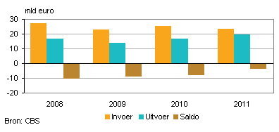 In 2011 is de waarde van de Nederlandse export van goederen naar de VS van Amerika met 16 procent gestegen tot 19,6 miljard euro. In 2010 bedroeg de exportstijging zelfs 21 procent. De invoer uit de VS daalde in 2011 echter met 6 procent tot 23,5 miljard euro. In 2010 steeg de import nog met 9 procent. Hierdoor nam het tekort op de goederenhandelsbalans met meer dan 4 miljard euro af tot 3,9 miljard euro.