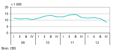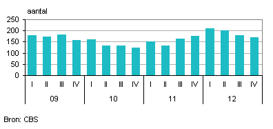 In het vierde kwartaal van 2012 is het aantal faillissementen in de detailhandel verder afgenomen in vergelijking met de voorgaande kwartalen van 2012. De piek lag in het eerste kwartaal van het jaar, met 211 uitgesproken faillissementen. In de volgende drie kwartalen liep dit aantal steeds verder terug. Uiteindelijk gingen er in het laatste kwartaal van het jaar 169 bedrijven failliet. Desondanks werd er over het hele jaar genomen wel een recordaantal faillissementen uitgesproken: 758 detailhandelsbedrijven sloten de deuren. Dit aantal ligt beduidend hoger dan in 2011 (623) en het zijn er ook meer dan in het voormalige ‘recordjaar’ 2009 (690).