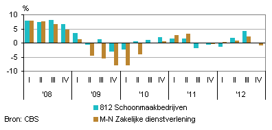 De omzet van de schoonmaakbedrijven nam in het vierde kwartaal van 2012 met 0,1 procent af ten opzichte van dezelfde periode een jaar eerder. In vergelijking met andere zakelijke dienstverleners deden de schoonmakers het minder slecht. De omzetafname van de totale zakelijke dienstverlening bedroeg 0,9 procent ten opzichte van een jaar eerder. Over heel 2012 heeft de schoonmaakbranche 1,1 procent meer omgezet. Deze toename is iets groter dan die van de totale zakelijke dienstverlening die over heel 2012 een omzettoename van 0,6 procent realiseerde.