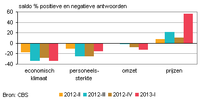 De ondernemers in de schoonmaakbranche zijn voor het eerste kwartaal van 2013 overwegend pessimistisch gestemd. Zo verwacht per saldo 34 procent een verdere verslechtering van het economisch klimaat. Over de werkgelegenheid zijn de ondernemers ook negatief gestemd. Per saldo verwacht 15 procent van de ondernemers een afname van de personeelssterkte. De twee voorgaande kwartalen voorzag per saldo een kwart van de ondernemers een vermindering van de personeelsinzet.