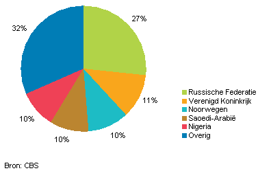 De Russische Federatie leverde in 2012 ruim 17,2 miljoen ton ruwe olie aan Nederland. Dit is 10 procent meer dan in 2011 en 27 procent van alle in Nederland ingevoerde ruwe olie. Hiermee is de Russische Federatie met afstand de belangrijkste olieleverancier van ons land. De top-5 levert ruim tweederde van alle olie. Binnen deze top-5 is de stijging van Nigeria opmerkelijk. Dit aandeel verdubbelde in de laatste 5 jaar.