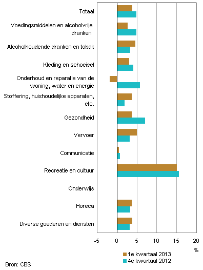 Op Sint-Eustatius is de inflatie in het eerste kwartaal van 2013 flink gedaald naar 3,9 procent. Dit is 1,0 procentpunten lager dan in het vierde kwartaal van 2012. De veruit belangrijkste oorzaak is dat elektriciteit flink in prijs is gedaald. Hierdoor was het onderdeel huisvesting, water en energie, waar elektriciteit deel van uitmaakt, in het eerste kwartaal 1,8 procent goedkoper dan een jaar eerder. In het vierde kwartaal van 2012 was huisvesting nog 5,8 procent duurder dan een jaar eerder. Ook voedingsmiddelen hadden een verlagend effect op de inflatie. Voeding was in het eerste kwartaal van 2013 2,7 procent duurder dan vorig jaar. Vorig kwartaal was dit nog 4,9 procent.