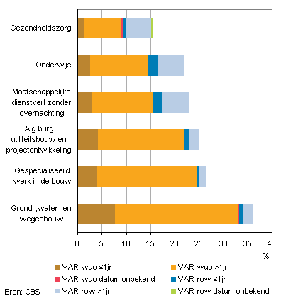 De bedrijfssectoren zijn opgebouwd uit verschillende bedrijfstakken, waarvan de grootste (minimaal 1 000 ondernemingen) nader onderzocht zijn. Daarbij is ook onderscheid gemaakt tussen de starters en de bestaande zelfstandigen zonder personeel. In 2011 hebben de zelfstandigen in de bedrijfstak grond-, water- en wegenbouw het vaakst een VAR-wuo verklaring (33 procent). Bijna een kwart van hen is in 2011 gestart als zelfstandige.