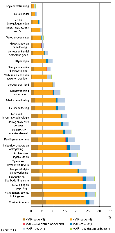 Zelfstandigen zonder personeel van wie het werk ook in loondienst gedaan kan worden, zijn wel gebaat bij een VAR-wuo. De bedrijfstakken post- en koeriers, managementadvies, beveiliging en film en tv-productie kennen met 24 procent het grootste aandeel zelfstandigen met een VAR-wuo verklaring. Ongeveer een kwart van de VAR-wuo verklaringen bij post en koeriers betreft zelfstandigen die in 2011 zijn gestart. De VAR-row komt vaak voor bij zelfstandigen die actief zijn in industrieel ontwerp en vormgeving en bij beveiliging en opsporing. Ook hiervan is ongeveer een kwart starter.