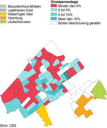 In de buurten die meer dan 500 inwoners tellen en niet binnen de Vinex-wijken liggen, nam het inwonertal in de meeste buurten in Utrecht en Amsterdam toe. Dit gold in Utrecht voor bijna 86 procent van deze buurten. De buurten waar het aantal inwoners het sterkst steeg zijn ’Transwijk-Zuid’ en ’De Uithof’. In Amsterdam groeide in ruim 65 procent van de buurten het aantal inwoners. De snelst groeiende buurten buiten de Vinex-wijken hier zijn ’De Omval’ en ’Osdorp-Midden’. In Den Haag is iets minder dan de helft van de buurten gegroeid. Hier groeiden de buurten ’Laakhaven-Oost’ en ’Bezuidenhout-Midden’ het sterkst. Rotterdam kende met ruim 41 procent van alle buurten het kleinste aandeel buurten waar het aantal inwoners toenam. Sterkst gegroeide buurten hier zijn ’Strand en Duin’ en ’Schiemond’.