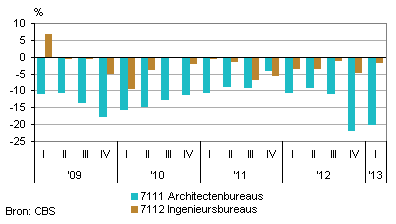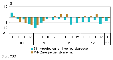In het eerste kwartaal van 2013 daalde de omzet van de architecten en ingenieurs met 3,4 procent ten opzichte van dezelfde periode een jaar eerder. De omzet daalt al sinds het tweede kwartaal van 2009. De zakelijke dienstverlening als geheel deed het wat minder slecht en realiseerde in het eerste kwartaal een omzetdaling van 0,6 procent.