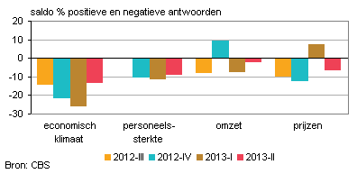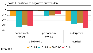 Uit de conjunctuurenquête blijkt dat het aantal ondernemers in de architecten- en ingenieursbranche dat het economisch klimaat heeft zien verslechteren, vergelijkbaar is met een kwartaal eerder. Per saldo nam 32 procent van de ondernemers een verslechtering van het economisch klimaat waar in het eerste kwartaal van 2013.