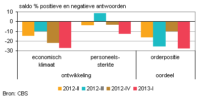 Het oordeel over de orderpositie was in het eerste kwartaal aanzienlijk slechter dan in het voorgaande kwartaal. Per saldo vond 28 procent van de ondernemers de orderpositie (te) klein. Een kwartaal eerder was dit 10 procent. De personeelssterkte kromp in het eerste kwartaal per saldo bij 13 procent van de bedrijven.