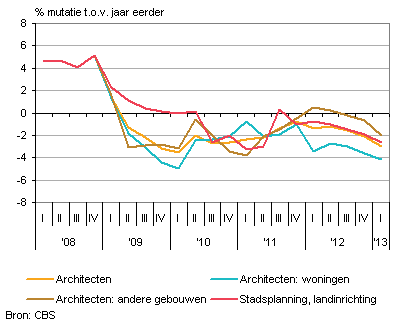 De daling van de prijzen is het grootst voor het ontwerpen van woningen. Door de aanhoudende malaise in de bouwwereld en op de woningmarkt waren deze diensten ruim 4 procent goedkoper dan in het eerste kwartaal van 2012. De tarieven voor het ontwerpen van niet voor bewoning bestemde gebouwen (utiliteitsbouw) daalden iets minder sterk, met 2 procent. De prijzen voor dienstverlening op het gebied van stadsplanning, landinrichting en landschap daalden met 2,6 procent.